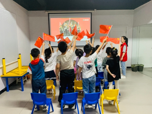 观影结束后,孩子们举起手里的小红旗在志愿者的带领下齐唱国歌,用歌声表达对党和祖国炽热的爱与赤诚的心。